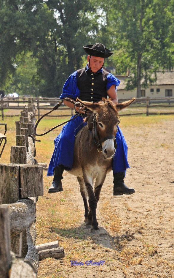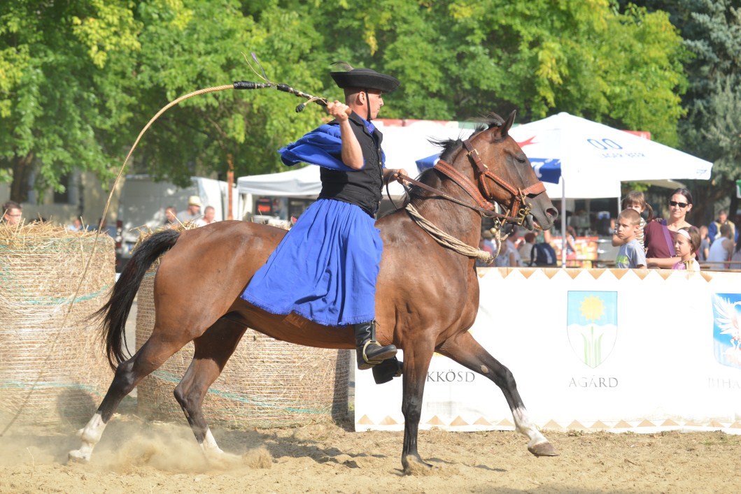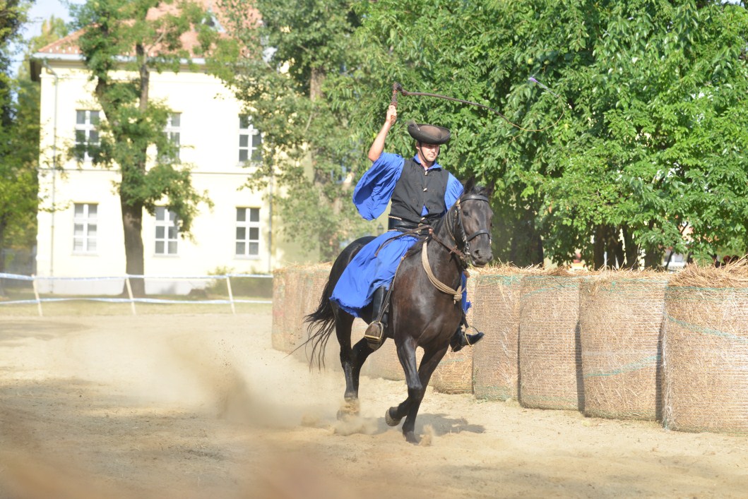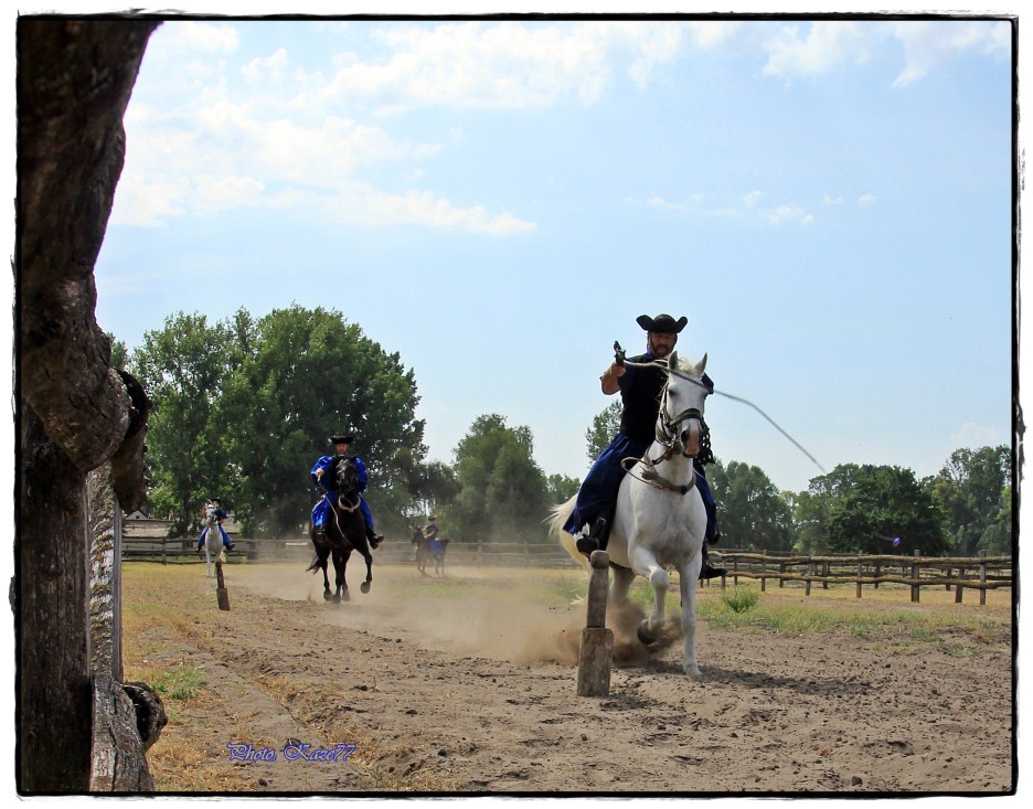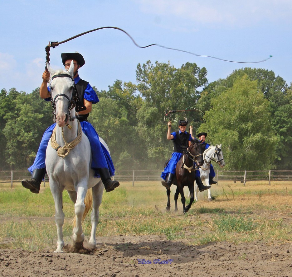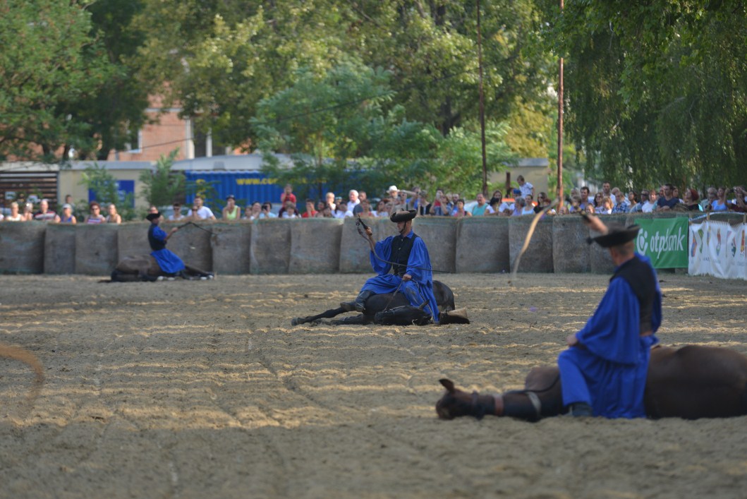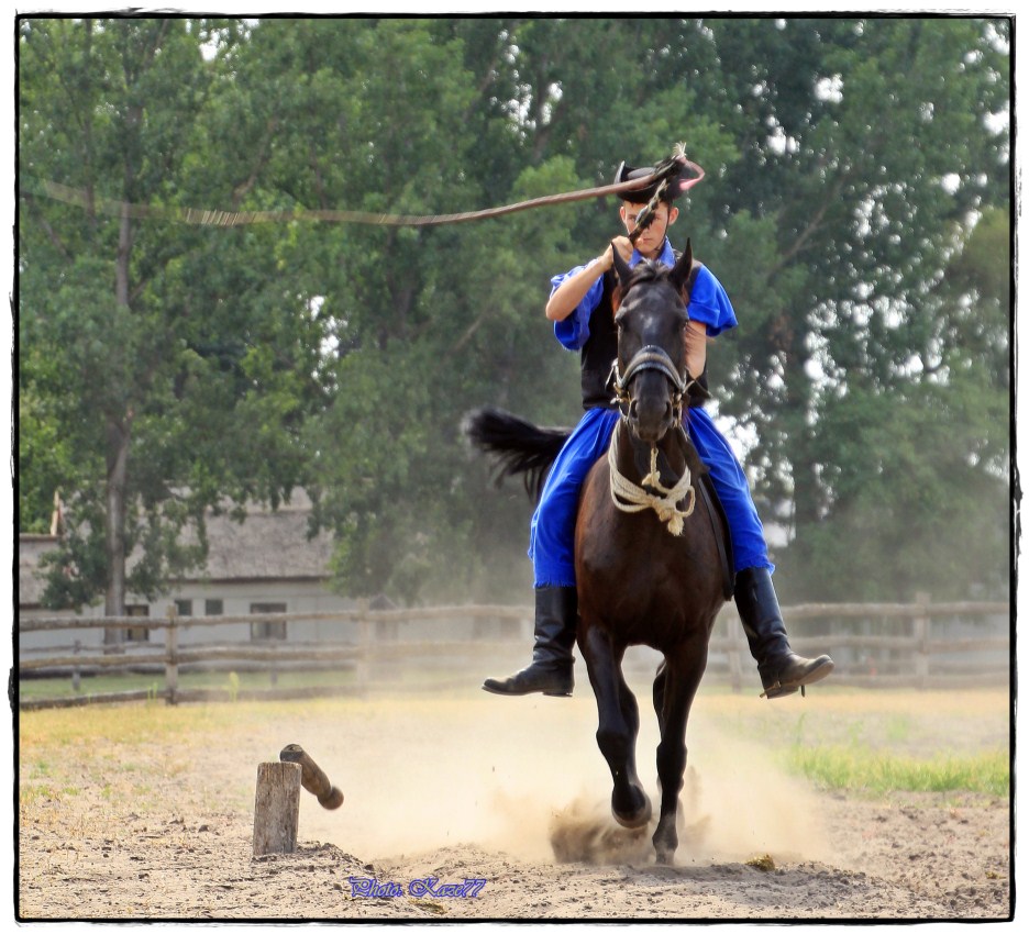 Lófektetés: A pusztai élet során gyakran előfordult, hogy a betyároknak rejtőzködniük kellett lovaikkal együtt a pandúrok elől. A lovaknak csendben és nyugodtan kellett feküdni a lovasok mellett. A karikás ostor csattogtatásával demonstrálják, hogy semmilyen zaj nem zavarta meg a lovakat, és így nem árulták el hol rejtőzött a betyár. | ![]() |