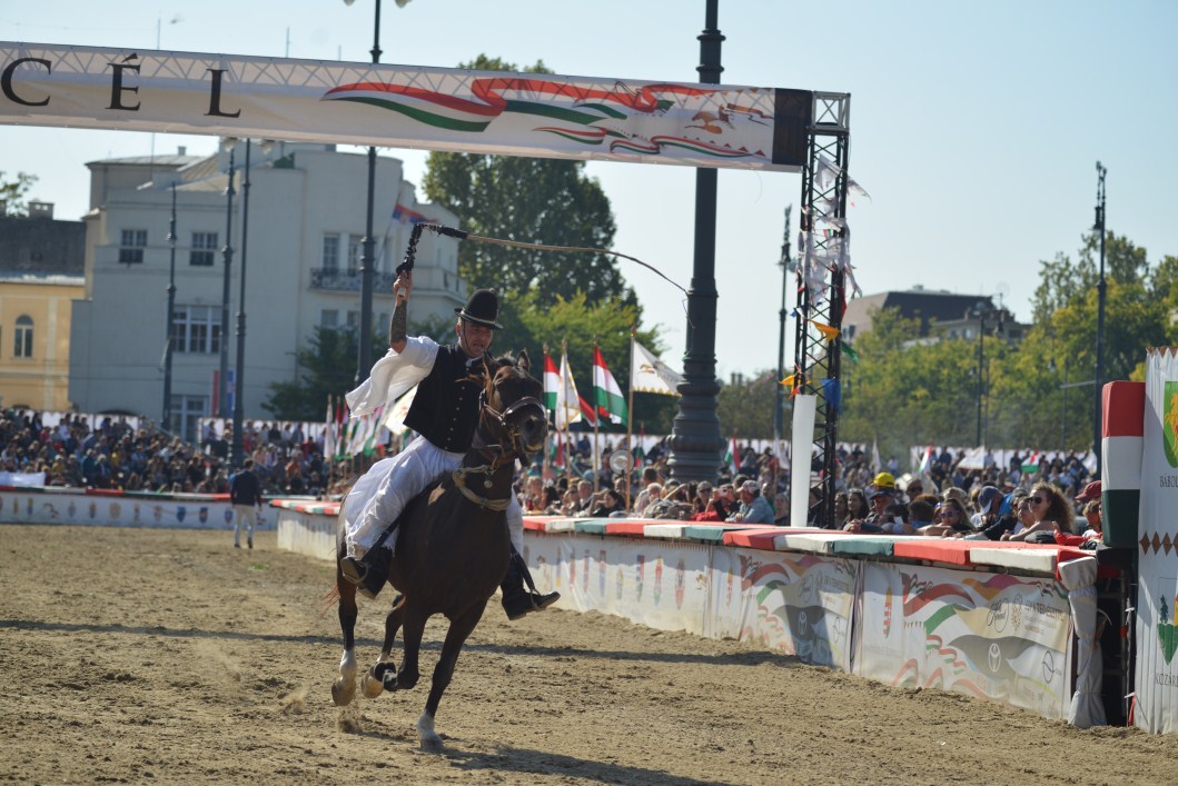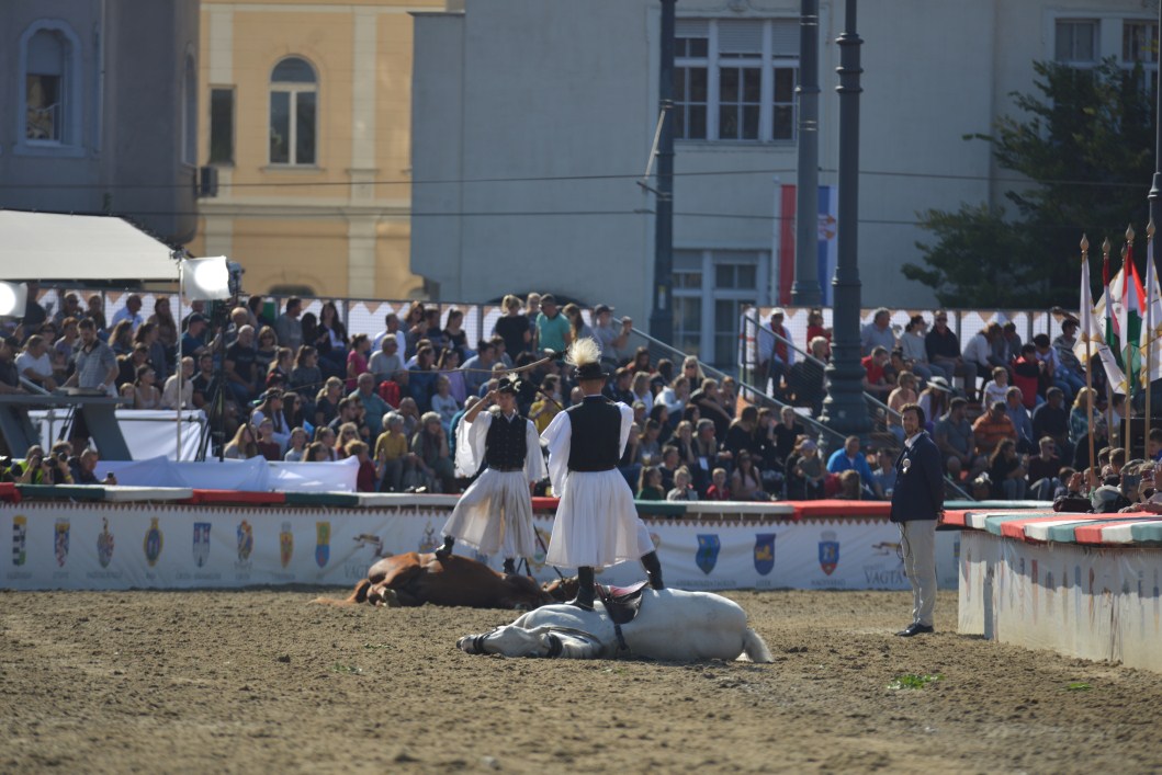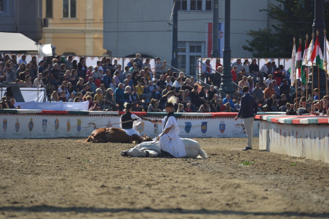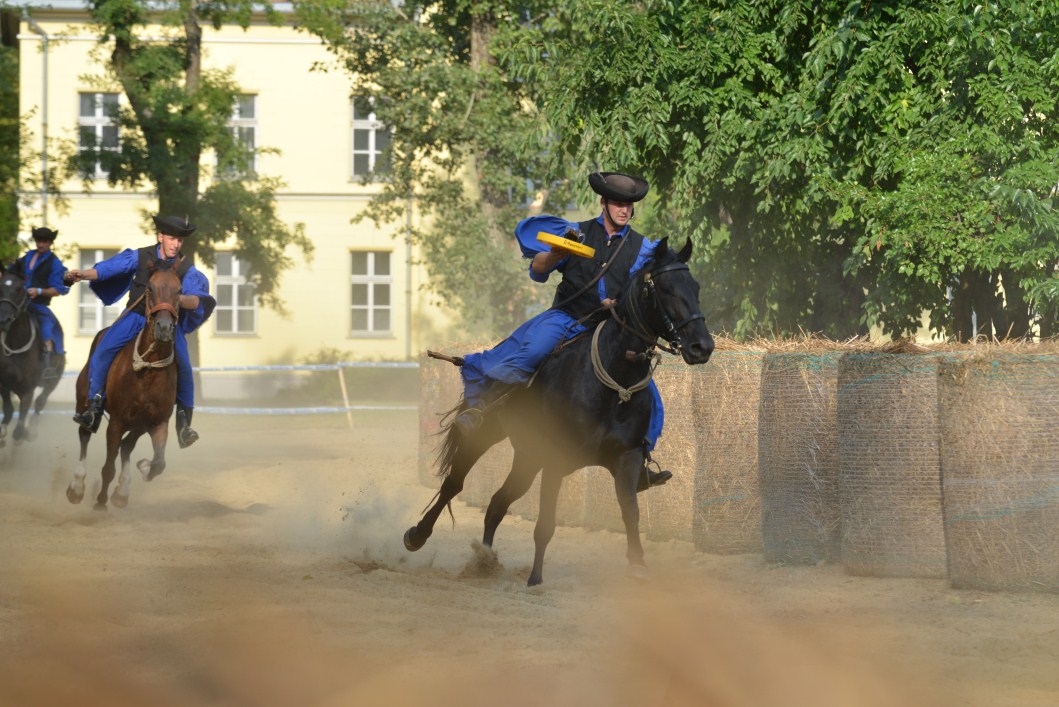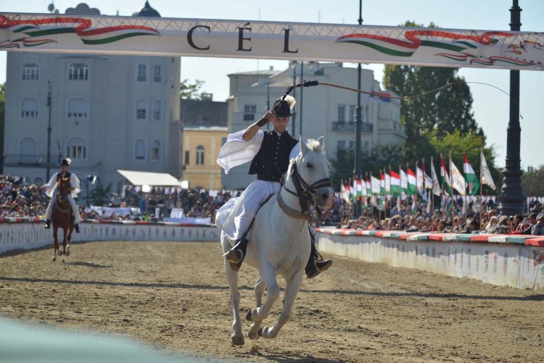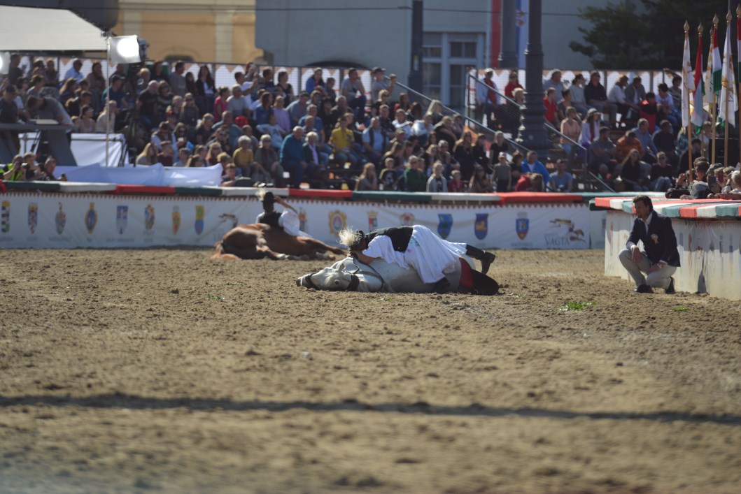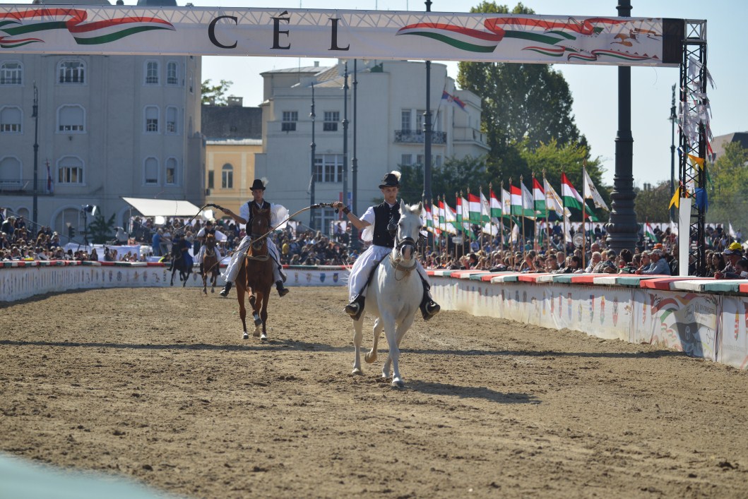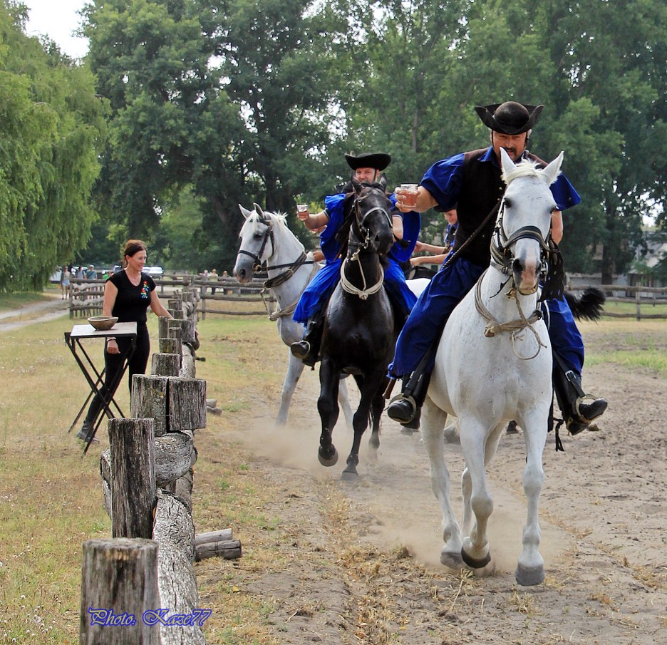 Ezt követően a poharas vágtát tekinthetik meg. Itt egy teli pohár itallal a kezükben vágtáznak körbe, és az a csikós a nyertes, akinek több ital marad a poharában. Természetesen a végén jól bekortyolják a megérdemelt itókát. | ![]() |